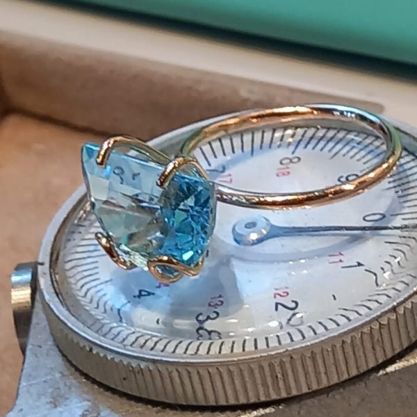 Anello in topazio azzurro taglio a finestra 10×14 realizzato a mano in oro 9 kt I LACCI